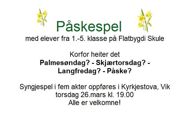 KVARDAGSSKULEN I VIK mandagar kl.17.30 i Kyrkjestova. Velkomen!