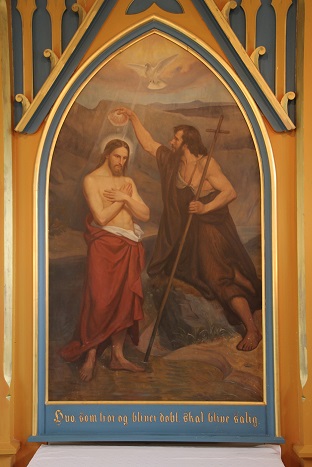 Altertavla med motiv: Jesus blir døypt av Johannes. Laga av Eivind Nielsen 1907, som ein kopi av Adolph Tidemann sitt altarbilete i Trefoldighetskirken, Oslo ( 1863).